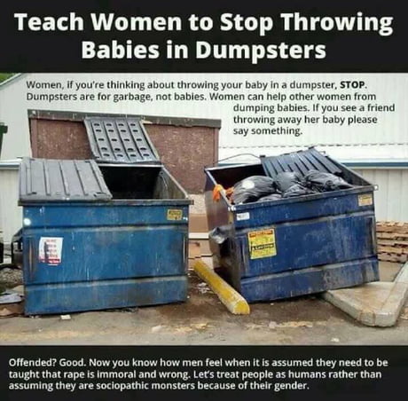 The details that the particular babies in the photo were aborted (and not eg stillborn), that they were found by the same volunteer shown washing them in the photo, and that he found them "behind an abortion clinic dumpster", aren't substantiated by the sources linked here but equally don't seem to be contradicted by those sources either Abandoned baby found in dumpster, family members missing Expand at 440 pm EDT NEBRASKA (MyFoxBostoncom) A disturbing case out of Nebraska has taken another strange twist On Wednesday, an 11monthold boy was found in a dumpster located outside an apartment complexThe Best 39 Dumpster Jokes Following is our collection of funny Dumpster jokes There are some dumpster litter jokes no one knows ( to tell your friends) and to make you laugh out loud Take your time to read those puns and riddles where you ask a question with answers, or where the setup is the punchline We hope you will find these dumpster